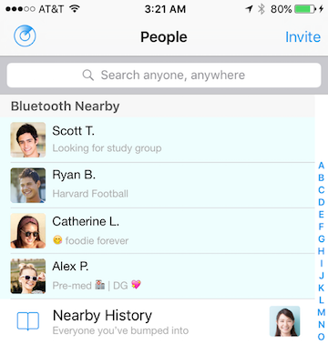 We also save a history of everyone you’ve bumped into, so forgetting, losing, or never asking for someone’s number is never a problem.